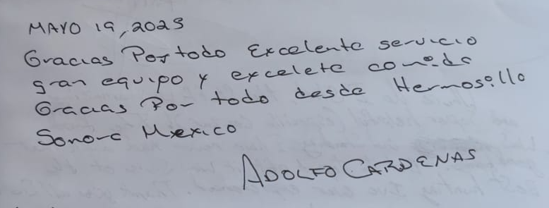 Gracias por todo. Excelente servicio, gran equipo y excelente comida. Gracias por todo desde Hermosillo, Sonora, México. - May, 2025
