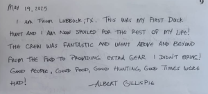 Being here last year with my son Chris and grandson Johnny, I still attest the service is impeccable... The ducks are in abundance and everyone, including the guides, make sure your experience is pleasurable. The presentation and quality of food is the best... it is wonderful. You are cared for as family. Dewayne Cain Rockwall, TX - May 2024